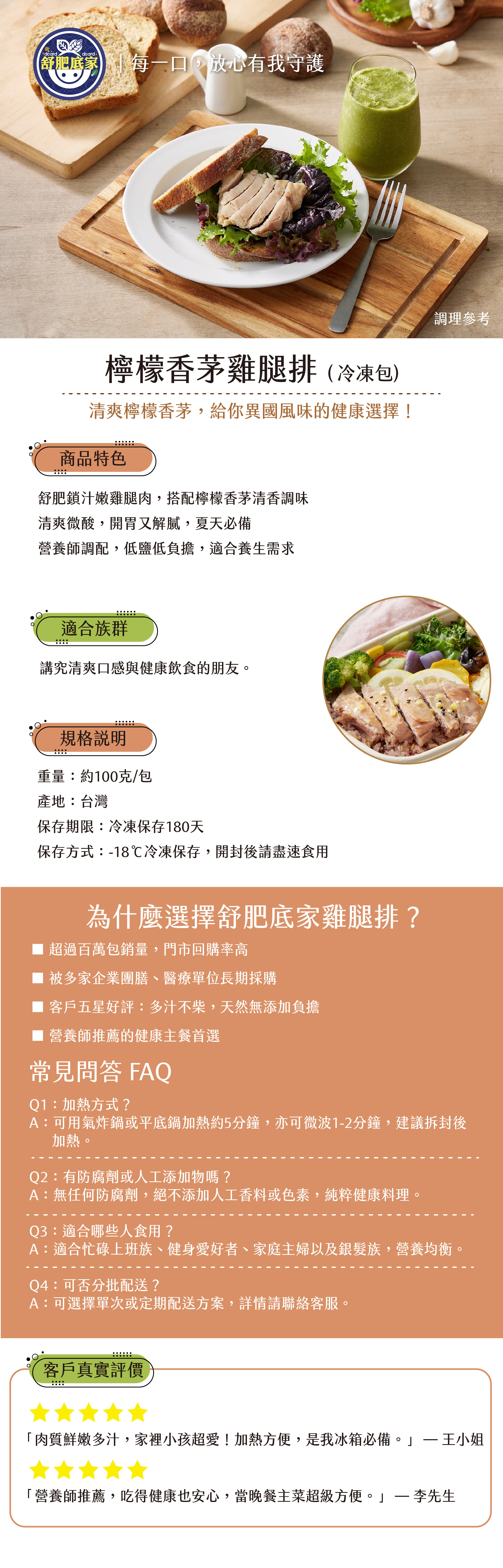 使用嚴選雞腿肉,以低溫舒肥工法精準控溫,保留肉質最嫩的口感。100g 小份量方便控制熱量,微波、氣炸、煎烤都能快速完成,是健身族與忙碌上班族的完美主食選擇。