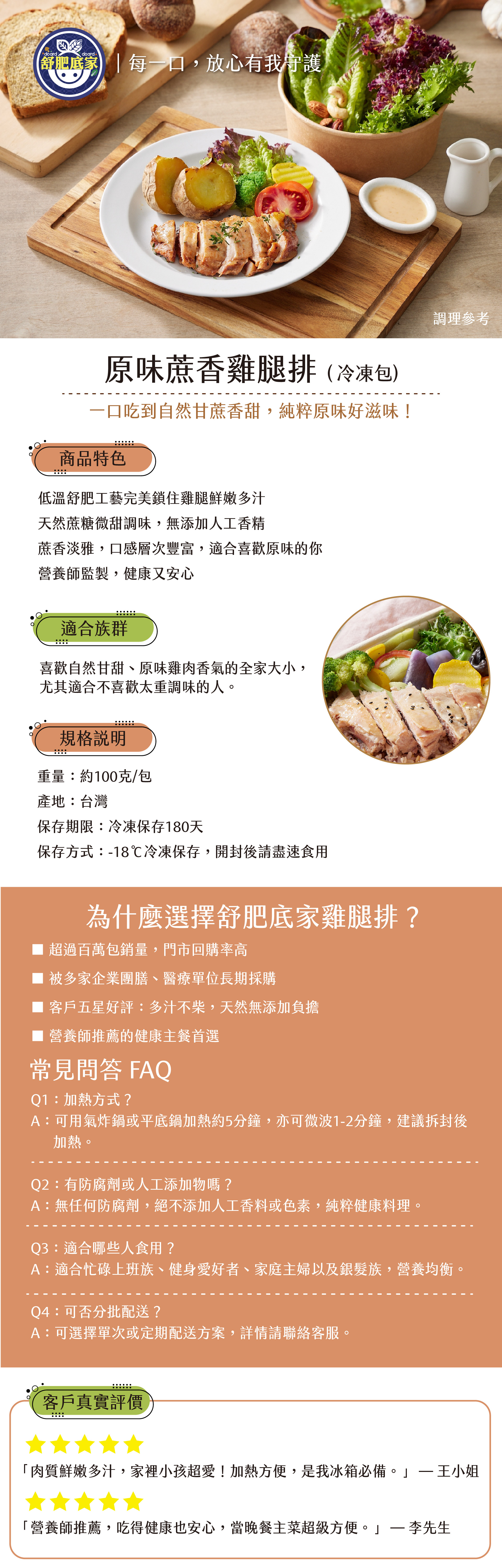 使用嚴選雞腿肉,以低溫舒肥工法精準控溫,保留肉質最嫩的口感。100g 小份量方便控制熱量,微波、氣炸、煎烤都能快速完成,是健身族與忙碌上班族的完美主食選擇。